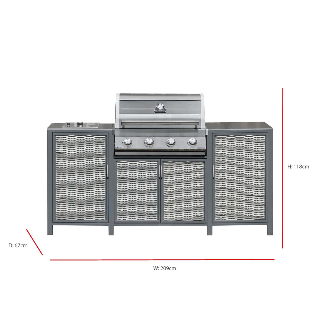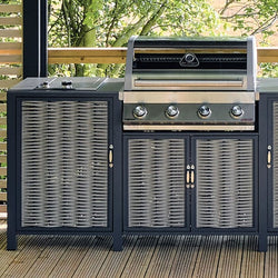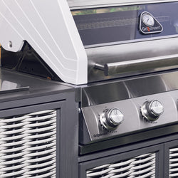 This weave and aluminium unit includes a built-in 4-burner barbecue, our gastro modular system and ample storage, perfect for all your grilling needs. Featuring a ceramic steak shelf side burner, a double-skimmed hood with a built-in thermometer and glass viewing panel for precise temperature control and ability to monitor. Also included is a foldaway warming rack, dedicated gas bottle storage and the added flair of colour-changing LED light-up controls. The easy maintenance of the removable fat cup completes this innovative, spacious, and technologically superior grilling unit.