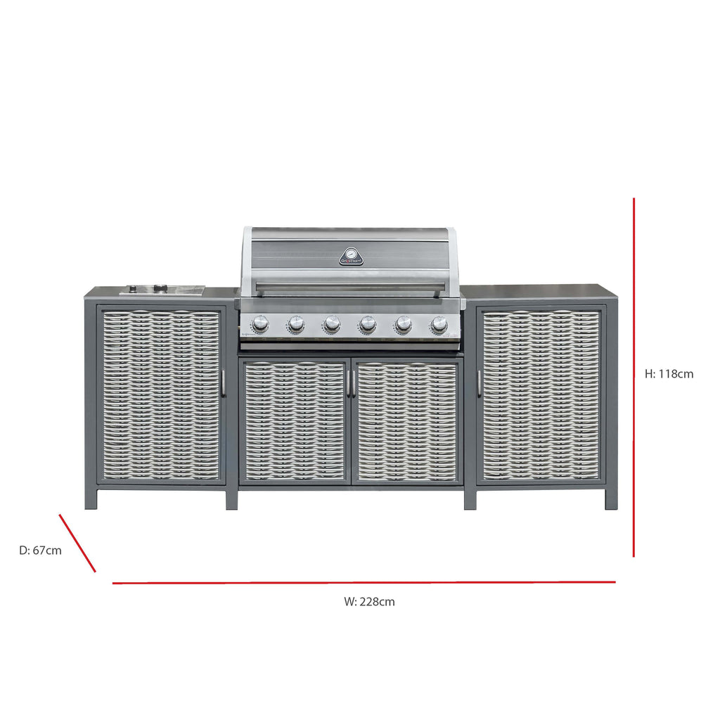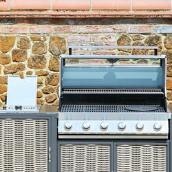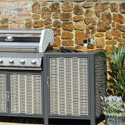 This weave and aluminium unit includes a built-in 6-burner barbecue with generous storage, ideal for all your grilling accessories. This outdoor kitchen has our gastro modular system and ceramic steak shelf side burner for added versatility, while also being equipped with a double-skimmed hood featuring a built-in thermometer and a glass viewing panel, ensuring precise temperature control. Additionally, it includes a foldaway warming rack, gas bottle storage, removable fat cup and colour-changing LED light-up controls that come together to form this superior outdoor cooking unit.